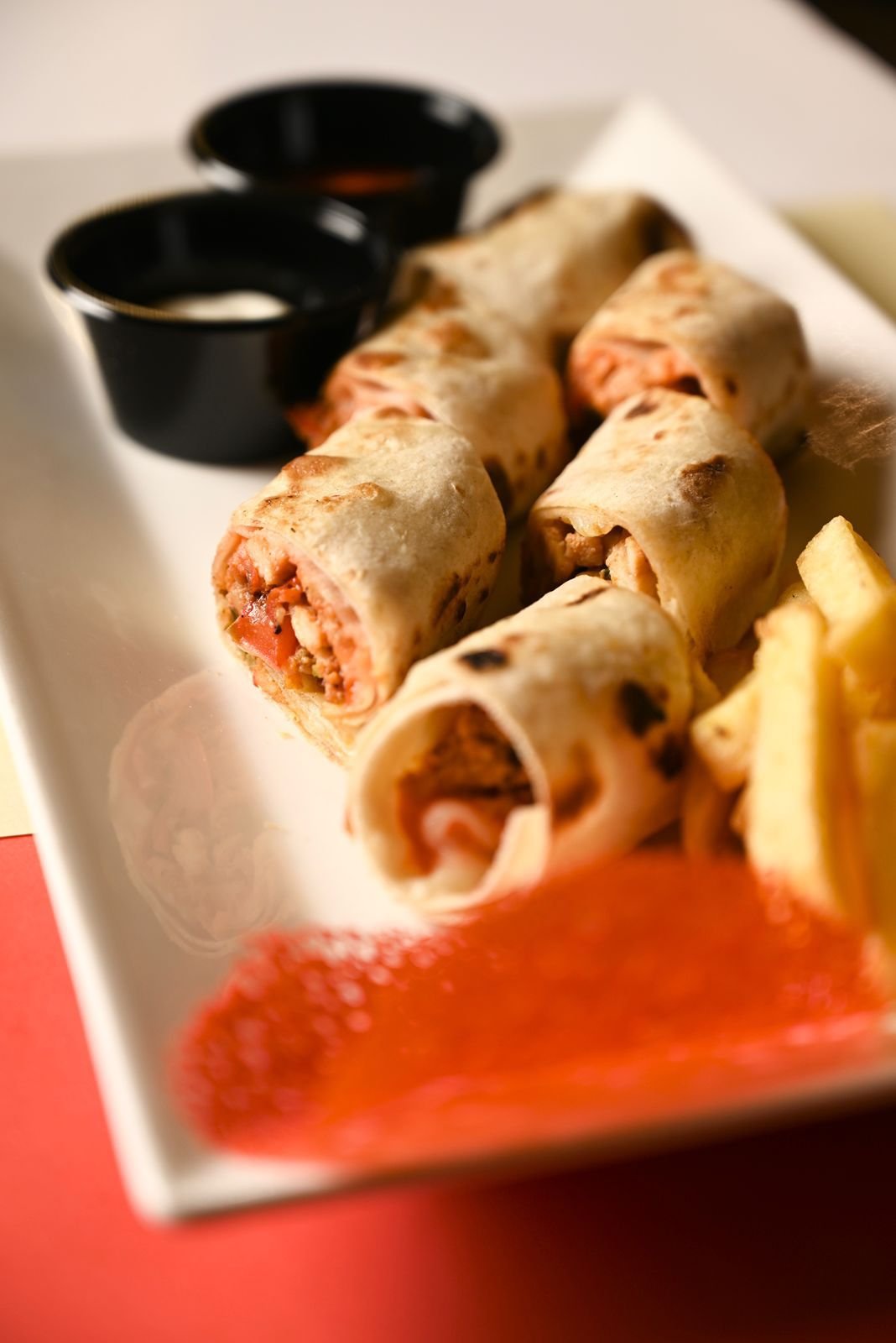 شرائح الدجاج المطهو مع الفلفل الرومى والبصل بالخلطة المكسيكية ويقدم مع التورتيلا والساور كريم (679 سعر حرارى)