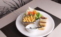 Slices of fresh meat cooked with Mexican seasoning, bell peppers, served with tortilla bread and sour cream (520 calories)