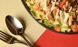 خس روما مع التونو كروتون والبصل الاحمر تقدم مع خلطة ميكسولوجى فيجان سيزر دريسينج وتقدم مع اختيارك من احدى الإختيارين أصابع الدجاج المشوى أو الجمبرى المشوى (860 سعر حرارى)